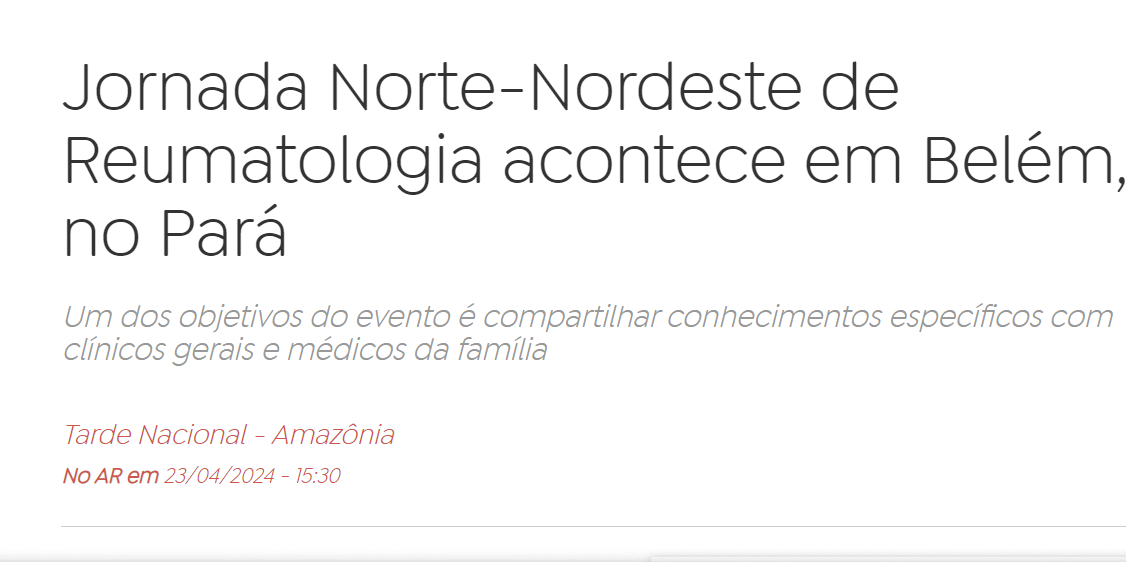 Em entrevista ao programa Tarde Nacional da Radioagência da EBC – agência pública de notícias – Agência Brasil -, dra. Louise Tandaya Bendahan, presidente da Sociedade Paraense de Reumatologia, chamou atenção para a realização e a importância da jornada para as regiões norte e nordeste do país e para a participação também de médicos de outras especialidades, além da reumatologia. Ouça a entrevista aqui.