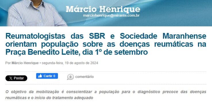 O jornal O Estado, do Maranhão, chama a atenção para a campanha da Sociedade Maranhense de Reumatologia em conjunto com a Sociedade Brasileira de Reumatologia que tem como objetivo conscientizar a população para o diagnóstico precoce das doenças reumáticas e o início do tratamento adequado. Confira aqui.
